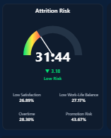 A dynamic gauge visual with configurable thresholds to monitor workforce stability. Ideal for tracking attrition risk trends over time and triggering alerts when risk crosses critical limits.