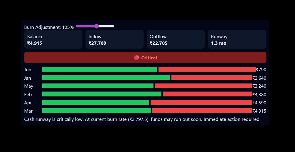 A real-time financial health dashboard that tracks cash inflow, outflow, burn rate, and runway. Includes dynamic risk indicators to help businesses avoid liquidity issues and plan ahead.