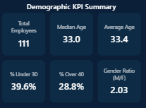 A compact KPI visual designed to track workforce diversity metrics including gender ratio, age distribution, and representation. Perfect for DEI dashboards and executive reporting.