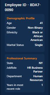 A comprehensive employee profile card that consolidates performance, tenure, engagement, and risk indicators into a single viewâideal for HR reviews and manager dashboards.