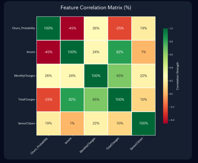 A professional heatmap designed to show the statistical relationship between different features. Perfect for identifying which factors (like tenure or charges) most strongly influence churn.