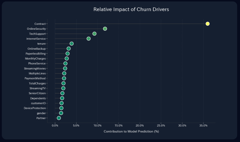 An importance-ranking visual that quantifies the contribution of each feature to the model's prediction. Helps stakeholders focus on the variables that matter most, like Contract type and Online Security.