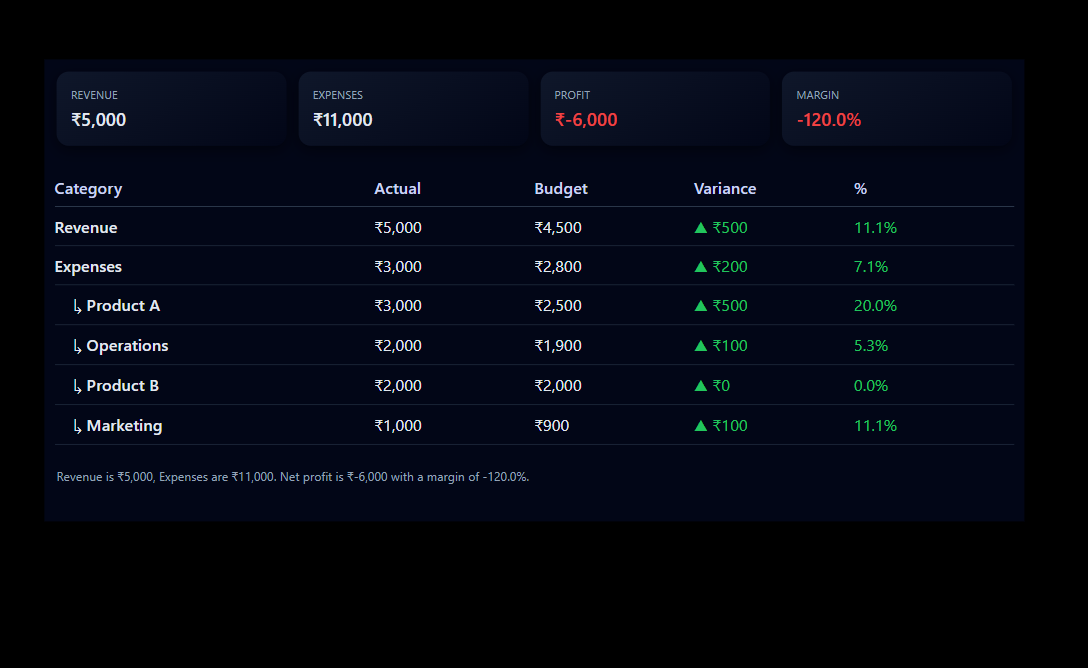 A financial performance visual that tracks actual vs planned values with clear variance indicators, helping finance teams quickly identify deviations and take corrective action.
