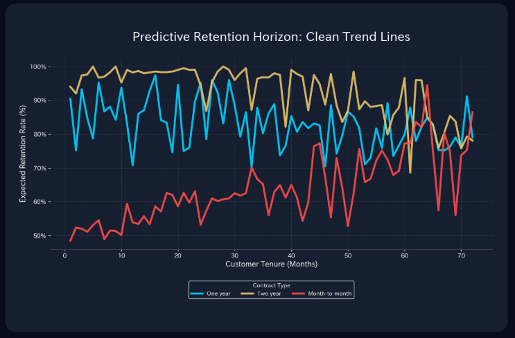 A multi-line trend analysis visual that tracks expected retention rates over the customer lifecycle. Essential for comparing the long-term stability of month-to-month vs. multi-year contracts.
