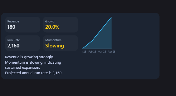 A trend-focused analytics visual that highlights revenue growth, run rate, and momentum indicators with narrative insights for strategic decision-making.