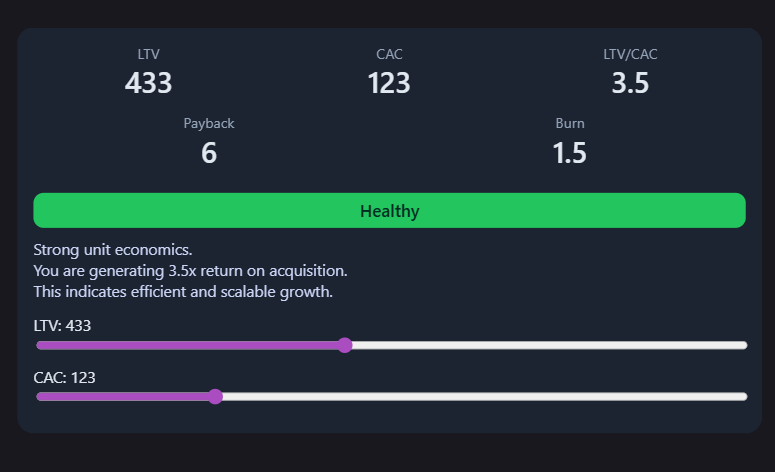 A strategic analytics visual that tracks LTV, CAC, payback period, and burn rate to evaluate business efficiency, scalability, and growth sustainability.