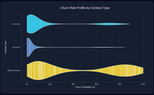 A high-fidelity violin plot that visualizes the probability distribution of churn across different contract types. It reveals not just the average risk, but the full spread and density of customer behavior.