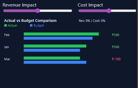 A flexible scenario planning tool that enables users to simulate changes in revenue, cost, or assumptions and instantly visualize financial impact across multiple dimensions.